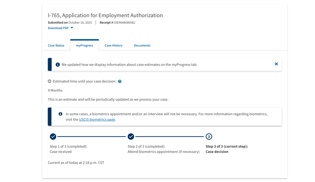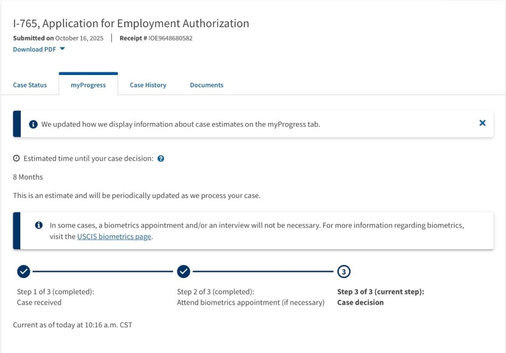 My experience applying for my Employment Authorization Document (EAD card) added more stress to my journey. I submitted my OPT application to U.S. Citizenship and Immigration Services (USCIS) website on October 15, 2025. Although my international advisor explained that processing typically takes three months and barely more than five, my case was assigned an eight-month timeline on December 8; and then the time period extended to nine months the next day. As an F-1 student, I can remain in the United States for only 60 days after graduation without a valid work authorization (Department of Homeland Security, Study in the States), which means long delays put students at risk of falling “out of status” through no fault of their own.